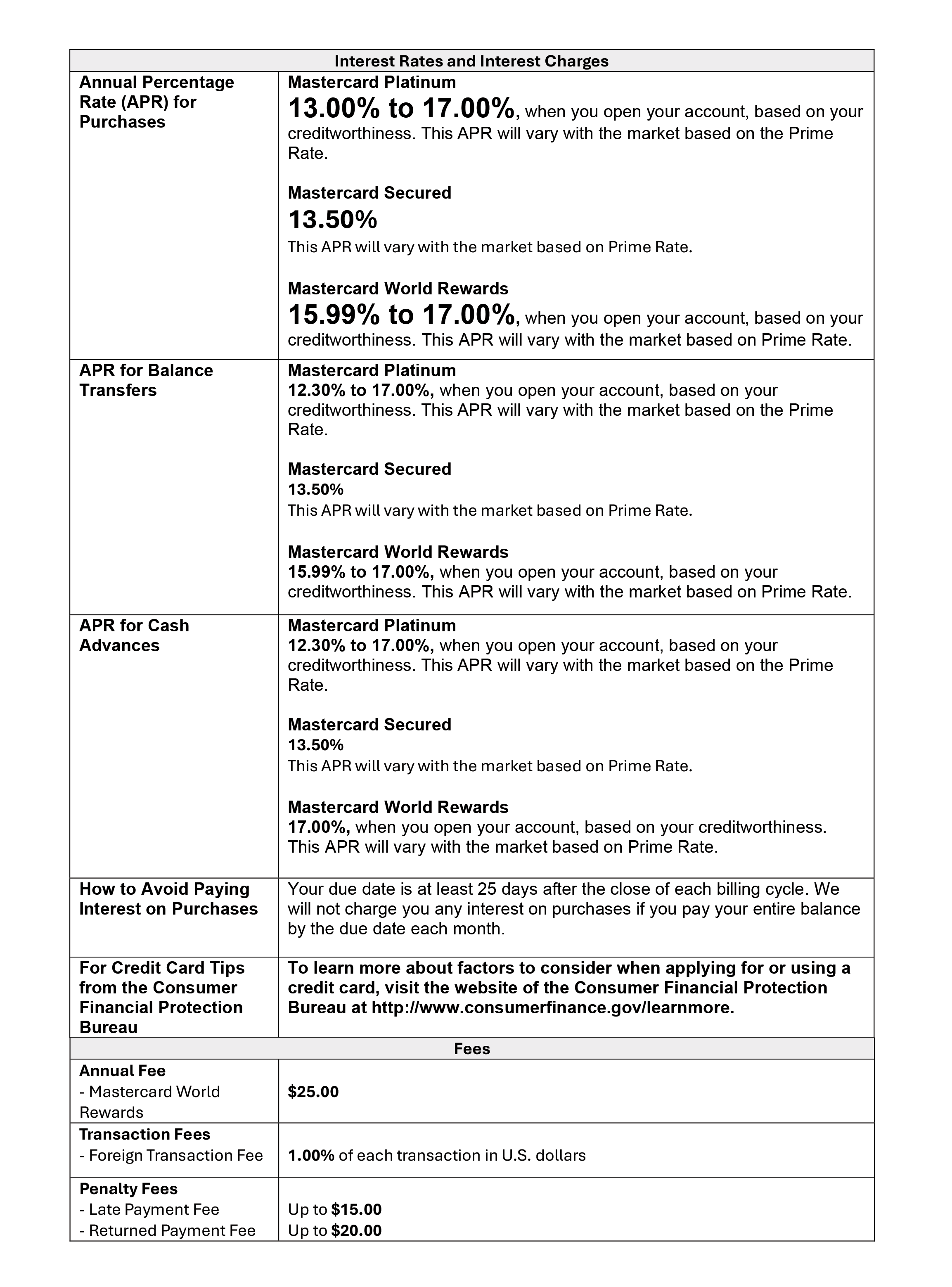 | MasterCard Rewards Card $25 Annual Fee, 25 Day Grace Period |